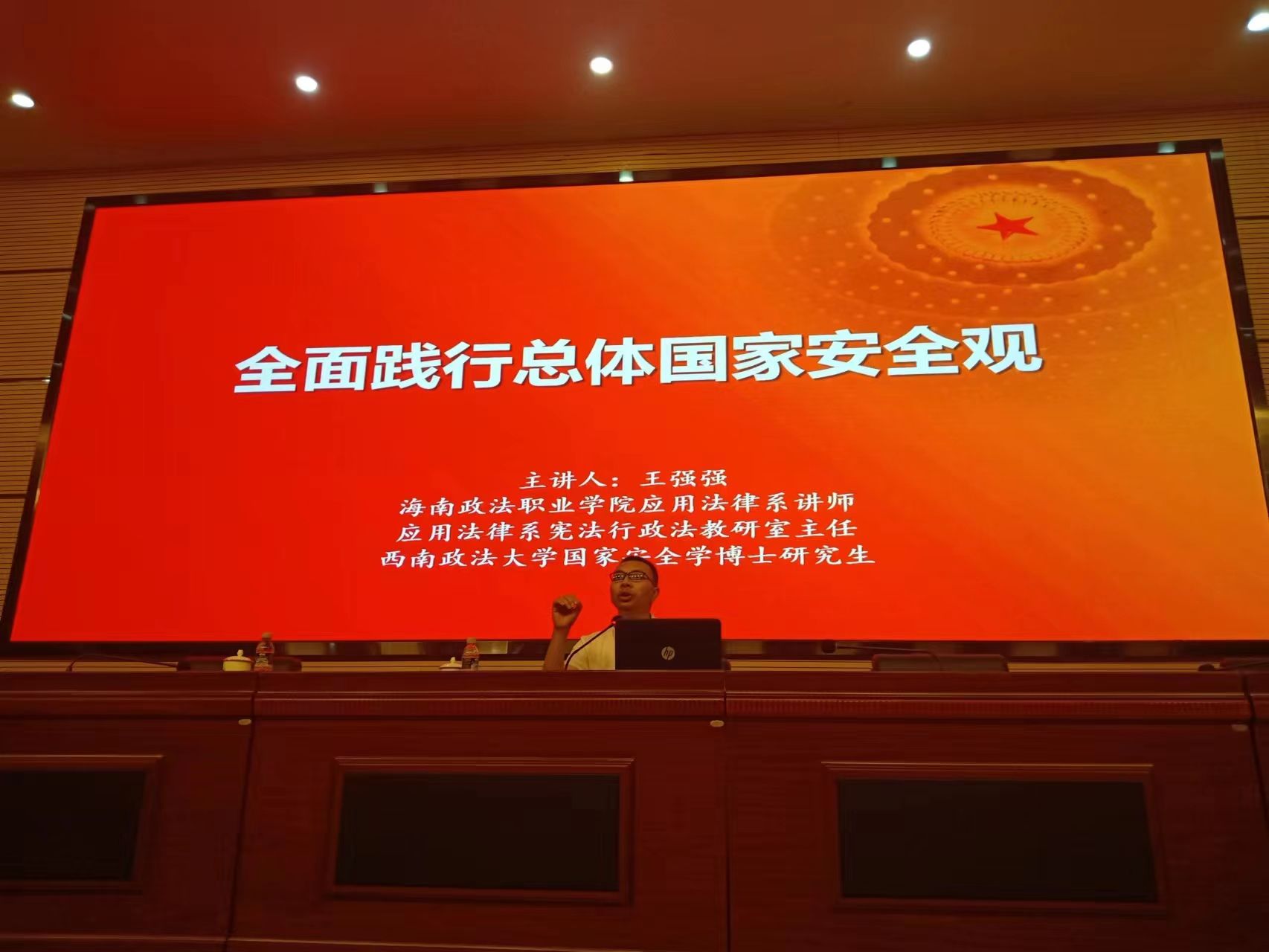 王强强围绕总体国家安全观的精神实质、政治安全面临的风险与挑战等方面作了精彩的阐述。通过经典案例,他讲述了什么是国家安全,怎样维护国家安全,最后告诫大家要牢固树立国家安全意识,珍惜和平环境,以高度的自觉性来维护国家安全和社会和谐稳定。
