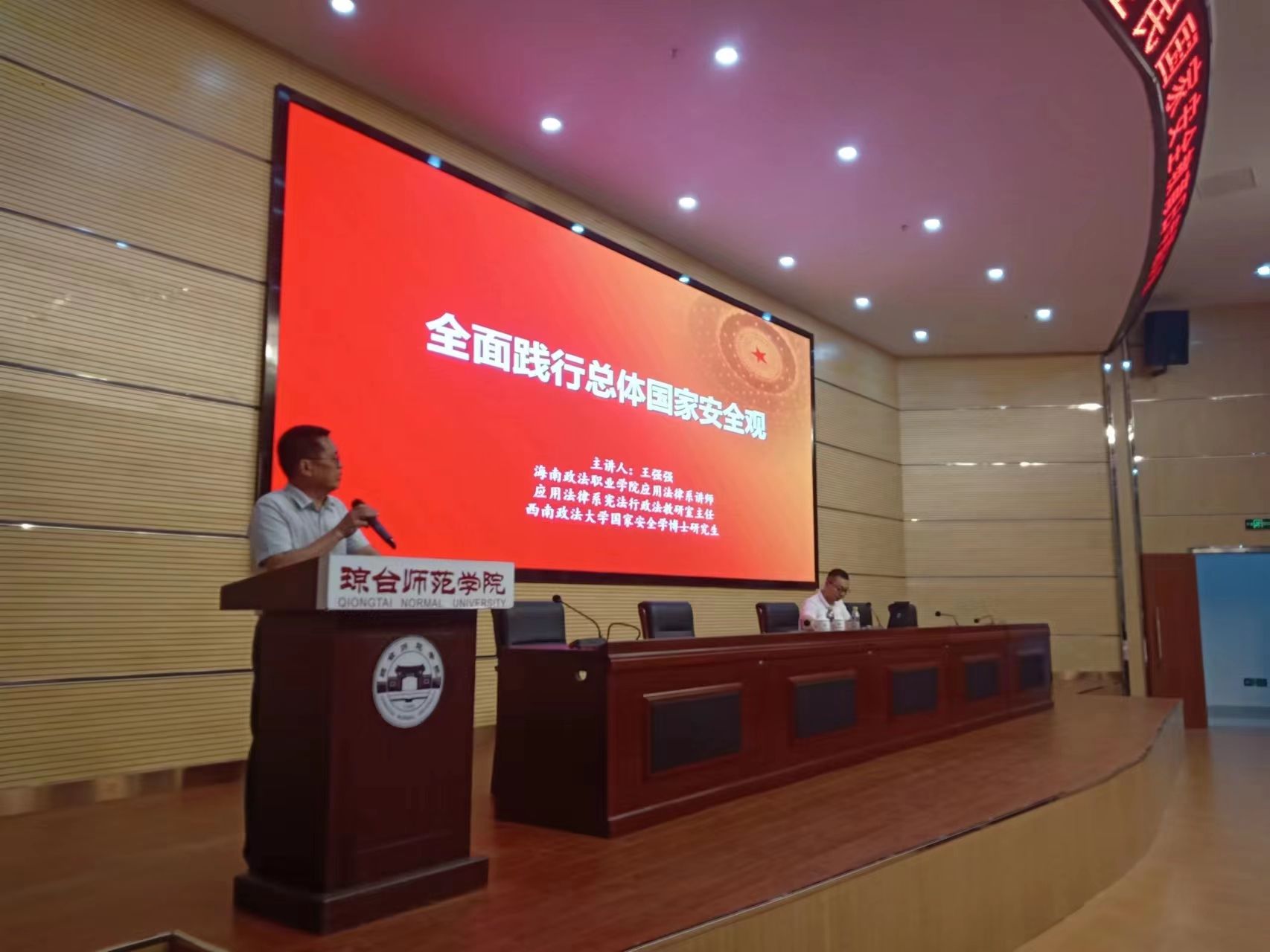 为增强师生家国情怀和国家安全观念,4月13日晚上,我校在图书馆报告厅举办了一场有关国家安全知识的专题讲座。本次活动由海南政法职业学院应用法律系讲师、宪法行政法教研室主任王强强博士主讲,宣传统战部、保卫处、学生工作处、团委、网络技 术中心、图书馆、档案馆等部门管理干部及各二级学院师生代表参加了此次活动。