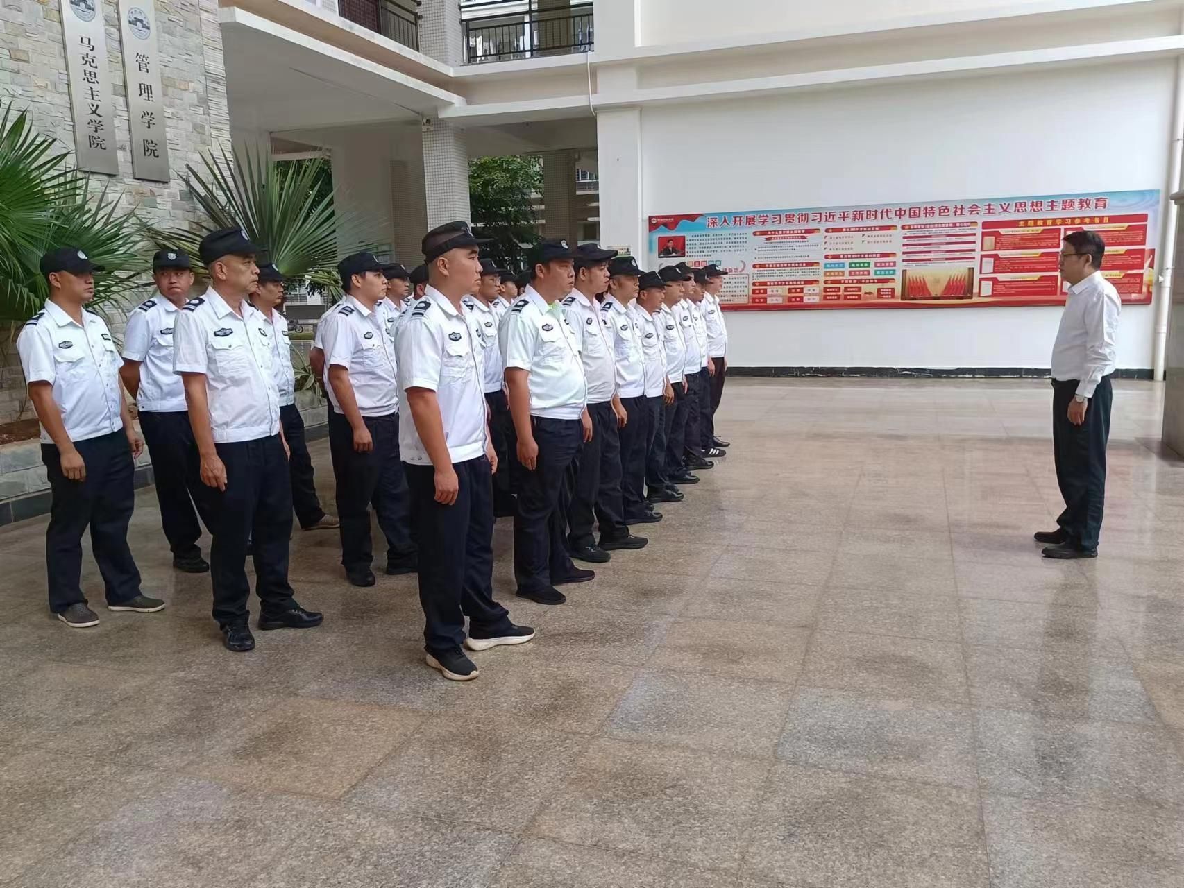 为切实做好保安管理工作,进一步提升保安员的文明礼貌执勤,依法照章办事的能力,10月31日下午,保卫处组织全体保安员开展集体学习《琼台师范学院保安人员管理条例》及进行集体操练。