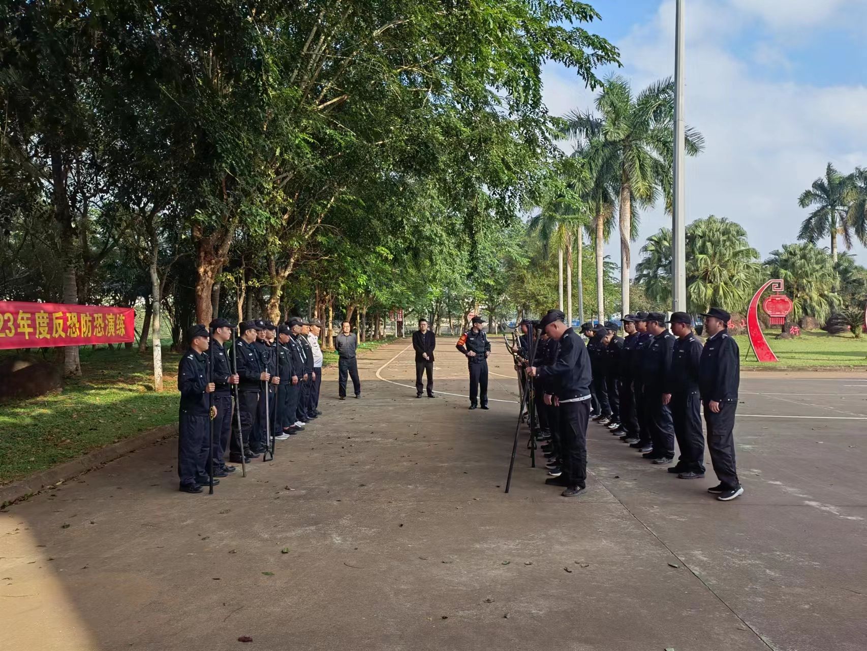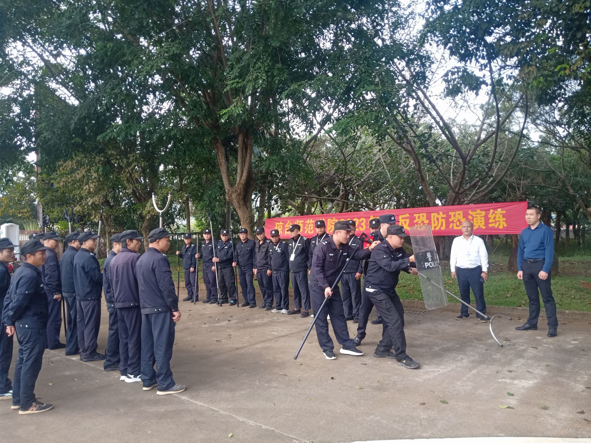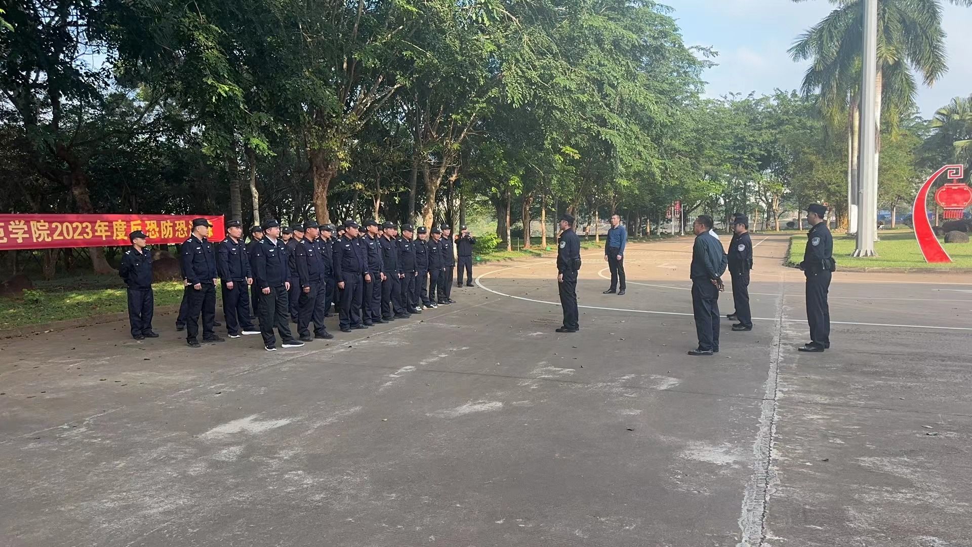 2023年是《中华人民共和国反恐怖主义法》颁布8周年,保卫处于12月28日邀请高校区派出所干警到校开展“全民反恐 共创平安”反恐怖宣传教育活动及反恐演练,推动警民协同凝聚反恐工作合力,坚决筑牢反恐防恐铜墙铁壁。演练结束后,陈立副处长对保安人员进行工作纪律教育等,增强保安人员责任意识、纪律意识。